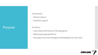 Abigail Ardeman proposes a pop music magazine targeted at girls aged 12-16. The monthly magazine will be available in both print and online formats, with the print version costing £2.75 and an annual subscription of £16.50. It will feature pictures, interviews, articles on pop music history and development, and competitions. The magazine will be promoted through social media platforms like Snapchat, Instagram, Facebook and Twitter.