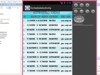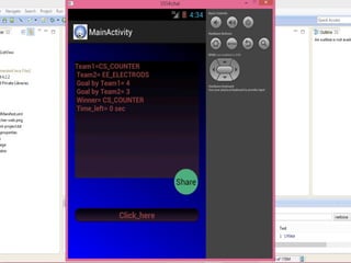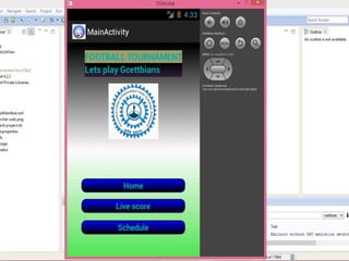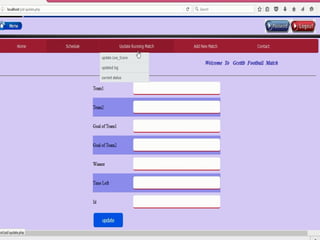 This document summarizes an online football app project. The project aims to provide an interface for users/clients and an admin/server to view live scores and updates from an ongoing college football tournament. Key features include viewing live scores, schedules, and statuses and allowing the admin to update match information and statuses. Future improvements could include adding audio commentary and videos of matches. The conclusion states that the app will provide an easy online solution for users and admin to access live tournament information and updates.