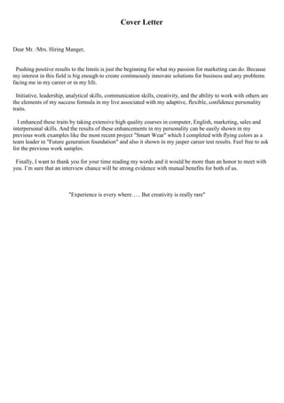 The candidate is applying for a marketing position and believes their passion for marketing can create innovative solutions for businesses. They highlight traits like initiative, leadership, communication skills and creativity that have led to their success. These traits were further developed through marketing, sales and interpersonal skills courses. As evidence, they cite a project they led as team leader where they received excellent results. The candidate has experience in customer service and requests an interview to further discuss how they can benefit the company.