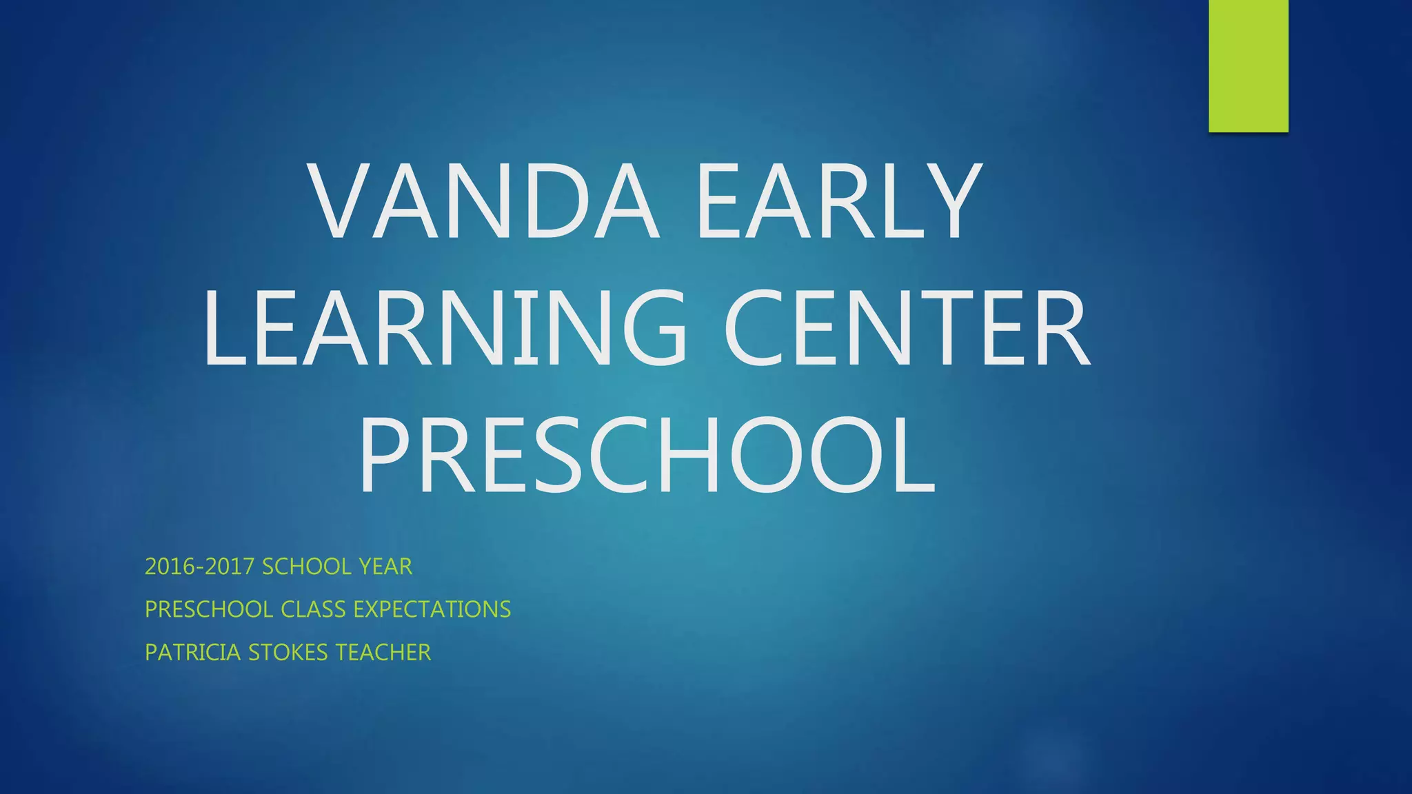 This document outlines the expectations and policies for Patricia Stokes' preschool class. It includes her philosophy of education, which emphasizes students advancing their knowledge to help others learn. Classroom rules focus on respectful behavior and cleaning up. The attendance policy rewards excellent attendance. Grades are given on a rubric scale from A to F. Homework can be completed in class or taken home, and there is a re-do policy for incomplete or failed assignments. The document also includes a first-person narrative where Stokes describes herself and her dreams of being an educator bringing happiness.