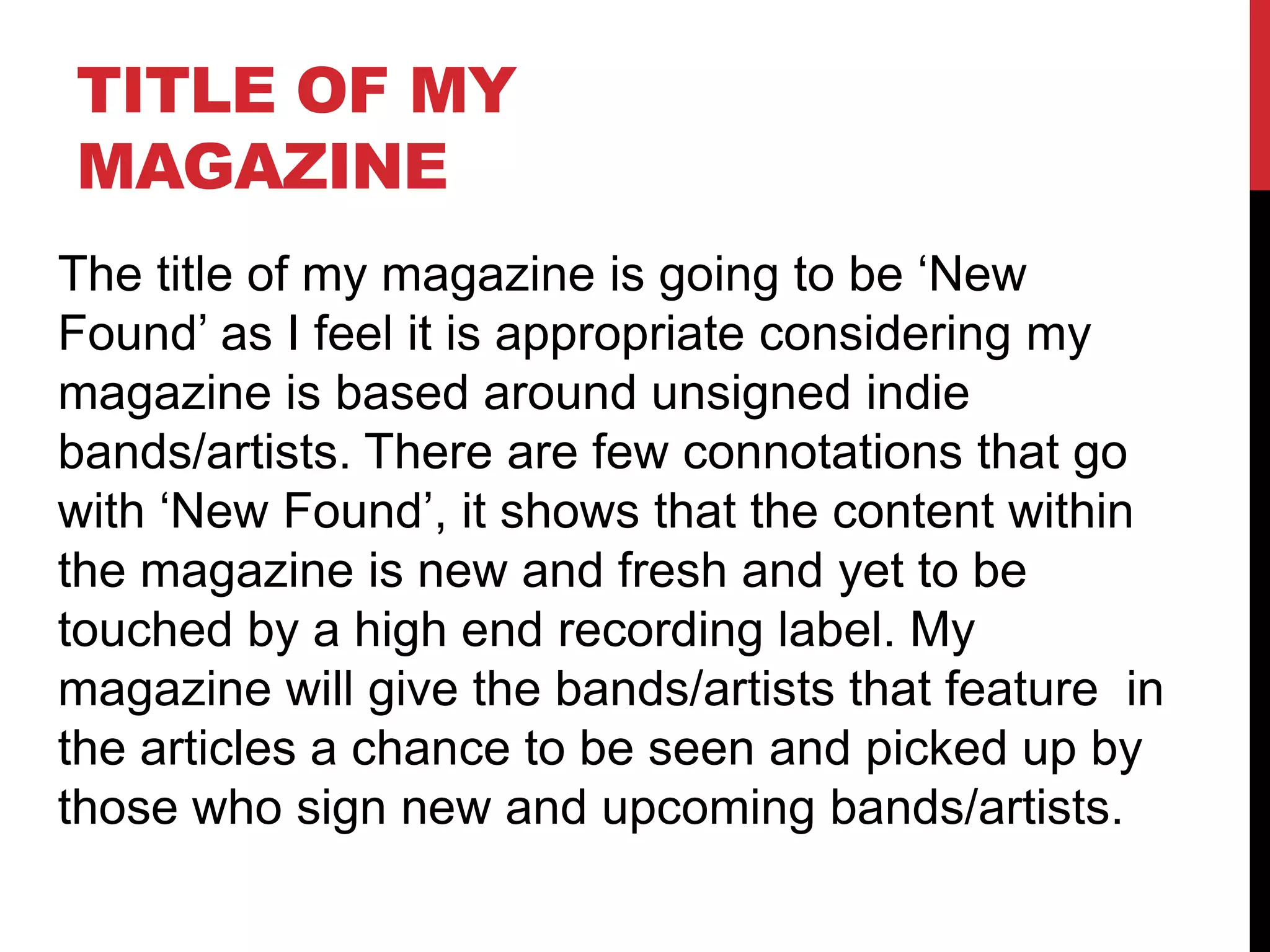 The document outlines the initial ideas for a new music magazine called "New Found" focused on unsigned indie bands. It will target 16-19 year olds interested in new music. The front cover will feature the main artist being profiled with the magazine title and footer. The contents page will follow magazine design conventions with images and an index. The double page spread will include a large lead image and interview text in multiple columns. Photographs throughout will use a variety of shots and styles.