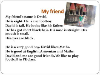 This document provides a description of a boy named David who is 8 years old and a schoolboy. David is described as tall with short black hair, a straight nose, small mouth, and black eyes. He resembles his father. David is a very good student who enjoys math and is good at English, Armenian, and math. The author notes they are good friends with David and like to play football together in PE class.