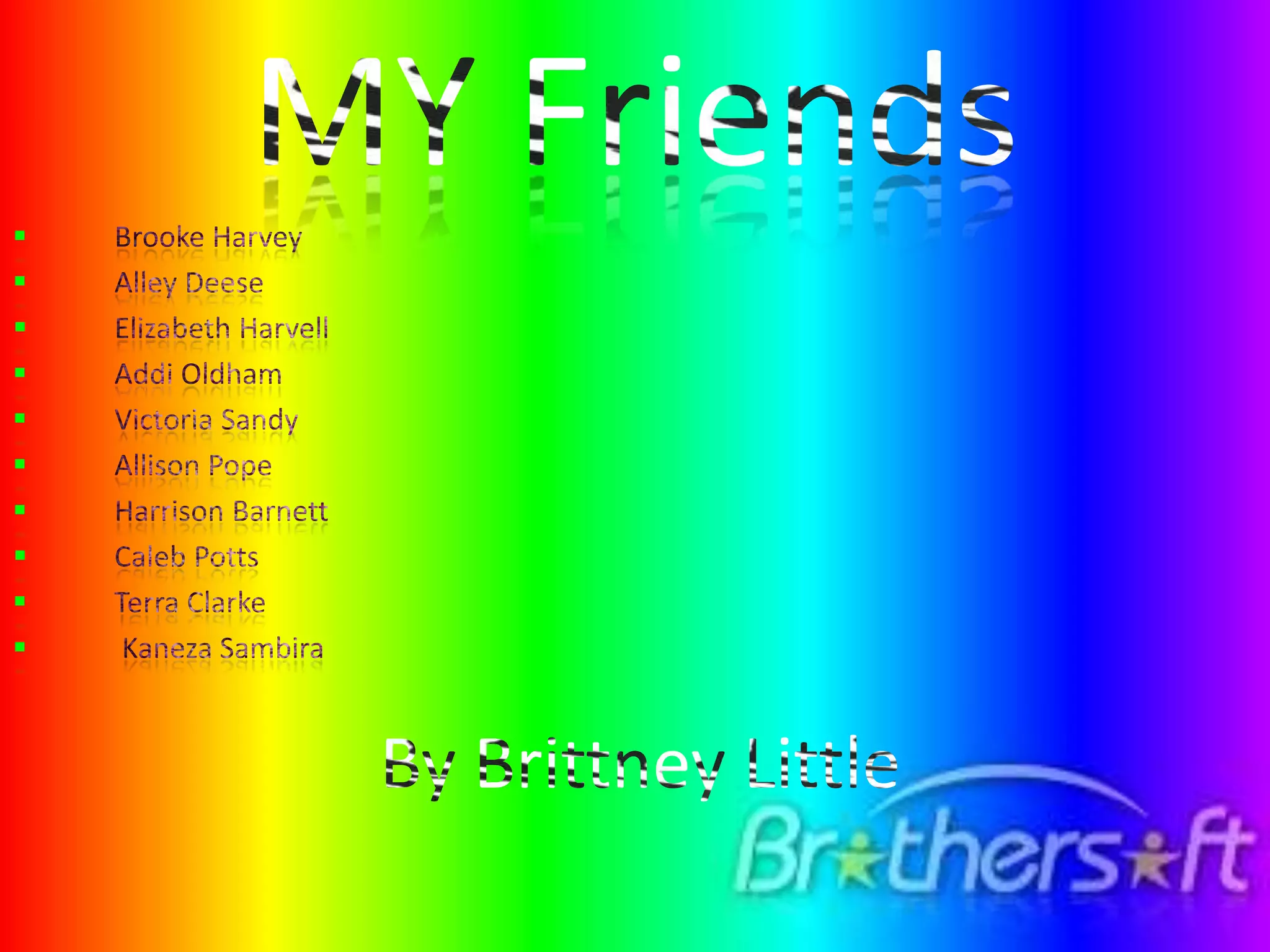 The document introduces 10 friends of the author: Brooke Harvey, Alley Deese, Elizabeth Harvell, Addi Oldham, Victoria Sandy, Allison Pope, Harrison Barnett, Caleb Potts, Terra Clarke, and Kaneza Sambira. For each friend, it provides a brief description of how the author knows them and their relationship.