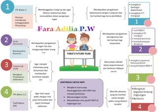 Rencana masa depan Fara bertujuan untuk membanggakan orang tua dan memudahkan dalam pengerjaan tugas sambil mendapatkan pengalaman di luar negeri. Dia ingin menjadi mahasiswa berprestasi yang lulus tepat waktu dan memberikan kontribusi kepada organisasi HMTI melalui partisipasi dalam acara dan lomba. Fara juga berfokus pada pengembangan softskill, kepemimpinan, dan manfaat bagi masyarakat.