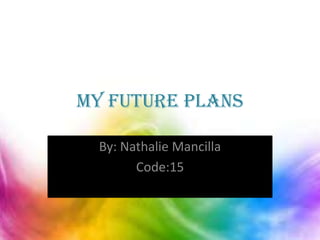 The document outlines Nathalie Mancilla's future plans, which include places she wants to visit like Guatemala, Los Angeles, Germany, Salzburg, and Brazil. She also lists jobs she would be interested in such as artist, dancer, painter, Green Peace Vice-President, human rights defender, being in a band, and firefighter, though she is unsure of what she wants to be. The document concludes by listing artists Nathalie wants to meet, including Avril Lavigne, Billie Joe Armstrong, Hayley Williams, Ke$ha, and Gerard Way along with proposed meeting dates and times.