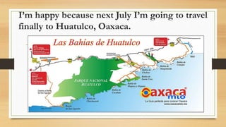 The author is excited to travel to Huatulco, Oaxaca in July with family and friends. They will take a bus to get there and visit important and beautiful places once arrived. The author plans to stay in a beach hotel, eat seafood, and enjoy the ocean, beach and pool with their family and friends.
