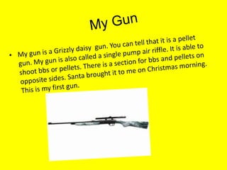 Bradley wrote about his new Christmas gift - a Grizzly daisy pellet gun. He enjoys target practice with his mom and grandmother in the backyard, where they shoot plastic bottles and cans placed on a wooden barricade. Bradley notes some gun safety tips, like never pointing the gun at anyone and always having a parent present when using it. He concludes by saying he loves his new gun and the project of writing about it.