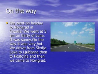 The document summarizes a student's holiday trip to Novigrad, Croatia. It describes the journey from Slovenia to Novigrad, unpacking at the destination and going for a swim. It also mentions the variety of delicious foods eaten each day, including swimming, watching sunsets each evening, going on a boat trip and visiting a circus.