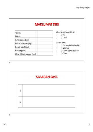 Dokumen ini adalah tentang projek 'my ibody', yang bertujuan untuk membantu peserta mengenal pasti dan mencapai berat badan yang ideal melalui pengawalan diet dan senaman. Ia termasuk maklumat mengenai pengiraan BMI, kalori dari makanan dan senaman, serta jadual pemantauan berat badan selama 30 hari. Terdapat juga senarai makanan dengan kalori serta senaman yang boleh dilakukan.