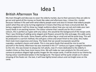 The feedback provided suggestions to improve the ideas presented by making the layouts and designs more detailed. Specifically, it was suggested to include details on font placement, sizing, and which elements would use varnishing. Developing the ideas with more precise recipes and incorporating related products like snacks or drinks was also recommended. The feedback found the themes of afternoon tea, international cuisine, and quick family meals to be interesting concepts that could appeal to different target audiences.