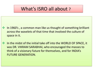 The document outlines the evolution of India's space program led by ISRO, initiated in the 1960s under Dr. Vikram Sarabhai's vision. It highlights ISRO's achievements, including the successful Chandrayaan-1 mission and the establishment of satellite systems like INSAT and IRS, promoting self-reliance in space technology. It emphasizes the opportunities for engineers and scientists in ISRO, portraying a career driven by passion and collaboration in pursuing advanced space projects.