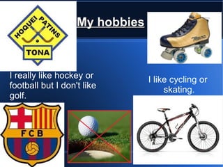 This document contains a summary of a student's interests which includes their favorite sports (hockey and football), food (macaroni and chicken), drink (lemon fanta), technology (Apple iPod Touch), region (Catalonia), friend (Senda Perez), social media activity (chatting on Facebook), music (Flo Rida's "Whistle" song), manga (Japanese manga like Dragon Ball Z), film (Harry Potter series), and book ("Els jocs de la fam" about a post-nuclear war USA).