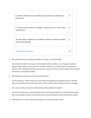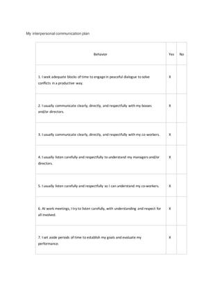 The document outlines an interpersonal communication plan reflecting on good communication skills and empathic listening. It identifies strengths such as respectful dialogue and areas needing improvement, specifically in organizing thoughts for clearer communication. Overall, the individual believes their approachability fosters confidence in sharing ideas, influencing positive results.