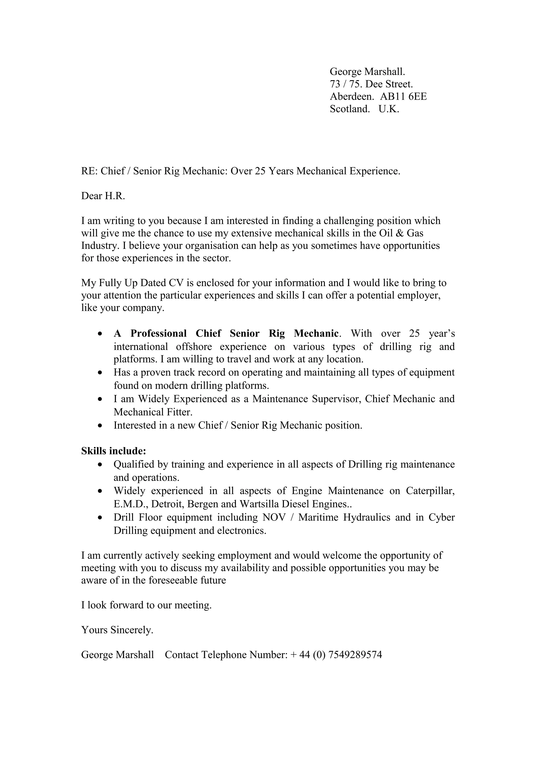 George Marshall is an experienced rig mechanic with over 25 years of experience in the oil and gas industry. He has worked internationally as both a chief mechanic and maintenance supervisor. His skills include maintenance and operation of all equipment found on modern drilling platforms, as well as experience working with various diesel engines and drill floor equipment. He is seeking a new position and is available to discuss opportunities.
