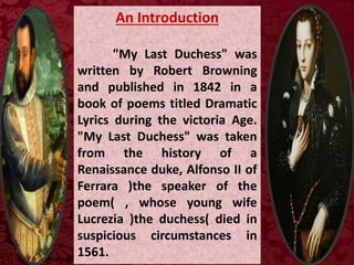 This summary provides background information on Robert Browning's poem "My Last Duchess" in 3 sentences: