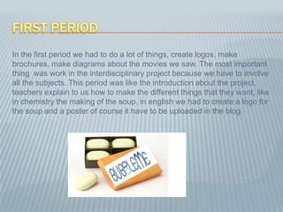The document summarizes the student's experiences in their last semester of high school, focusing on an interdisciplinary project where students created a soup product. Over three periods, students created marketing materials, presented on nutrition topics, and finally presented their soup to the school and received feedback. While sometimes boring, the student felt they learned a lot through this project and new experiences, and are proud of their work and feel prepared to pursue future goals after high school.