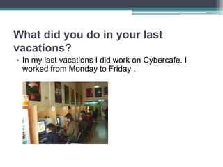 In his last vacations, Manuel worked at a Cybercafe from Monday to Friday. He visited his aunt Alejandra in Morelos where he went swimming with his cousin Ivan and they ate Mexican food. Manuel also went to a center in Iztapalapa with his coworker Blanca where they bought ice cream, visited his girlfriend Nataly at her house and they went to the cinema with her friend Cecilia to see his favorite movie. Manuel and Nataly also went to Chapultepec Park where they went for a long walk, and another day Nataly visited Manuel at his job before going back to his house to watch movies and eat quesadillas.