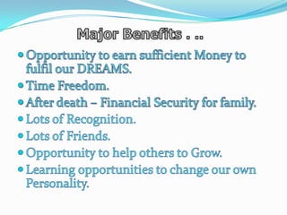 This document promotes a direct selling business opportunity. It states that there is zero risk to become a distributor by purchasing coupons worth Rs. 5,000. As a distributor, one can earn sales turnover bonuses weekly from 12% of matched business volume between two organizations in their network. Distributors can also earn 1% of the company's monthly global business volume as a performance bonus. The opportunity requires no money investment, qualifications, or experience - just time investment to introduce the opportunity to others and help them grow.