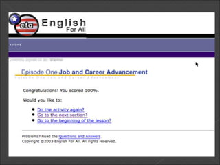 The document discusses goals and experiences with improving English listening and speaking skills. The goals are to learn new expressions, vocabulary, and have conversations lasting 3 minutes or more, as well as improving listening comprehension. Positive experiences included participating in group conversations, while negative experiences involved limited free time matching lab hours. Programs could be improved to better help achieve goals. Practicing speaking with fluent partners, watching movies, and using listed programs were recommended to learn English without boredom.