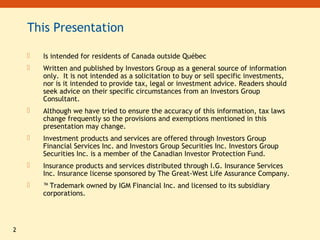 This document provides an overview of estate planning. It discusses the importance of estate planning and having a will. It outlines key elements of an estate plan including appointing an executor, setting up powers of attorney, understanding taxes, and probate. The document also reviews various estate planning strategies such as beneficiary designations, joint ownership, gifting, insurance, and trusts. It emphasizes the importance of working with an estate planning team that includes a financial advisor, lawyer, and accountant to develop a comprehensive plan tailored to an individual's specific goals and situation.
