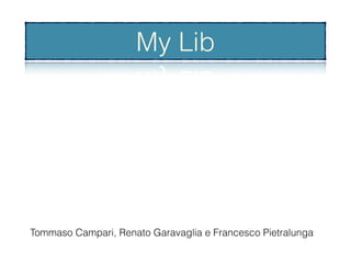 L'applicazione My Lib è progettata per tracciare la carriera universitaria degli utenti, integrando il supporto ai social network e garantendo un'interfaccia user-friendly. Gli utenti possono gestire esami superati, programmati, orario delle lezioni e note attraverso diverse funzionalità di aggiunta e modifica. La schermata iniziale consente l'accesso tramite login e registrazione, permettendo la personalizzazione dell'immagine profilo e la visualizzazione di dati pertinenti.