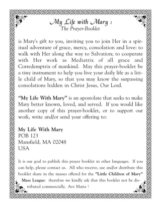 This document contains prayers and devotions to be recited daily with Mary. It includes morning and evening prayers focused on Mary such as the Angelus, rosary, and spiritual communions. The document also provides information about the "My Life With Mary" apostolate which seeks to make Mary better known and served.
