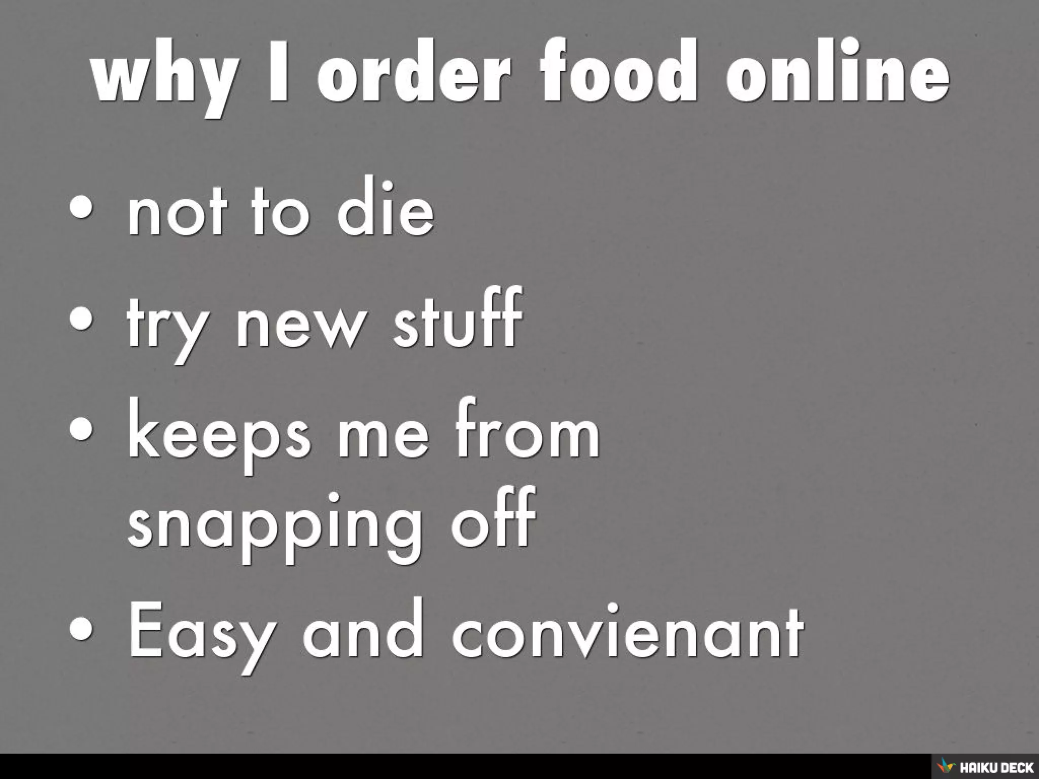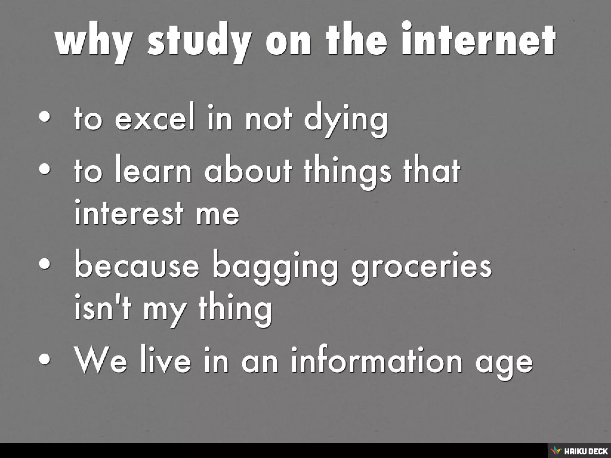 This short document promotes creating presentations using Haiku Deck, a tool for making slideshows. It encourages the reader to get started making their own Haiku Deck presentation and sharing it on SlideShare. In a single sentence, it pitches the idea of using Haiku Deck to easily create and share slideshow presentations online.
