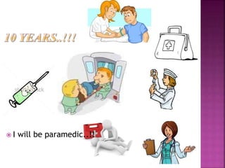 The document outlines an individual's future goals which include becoming a paramedic, living in Canada, meeting the love of their life, starting a family, traveling around the world with their family, and creating a foundation to help animals.