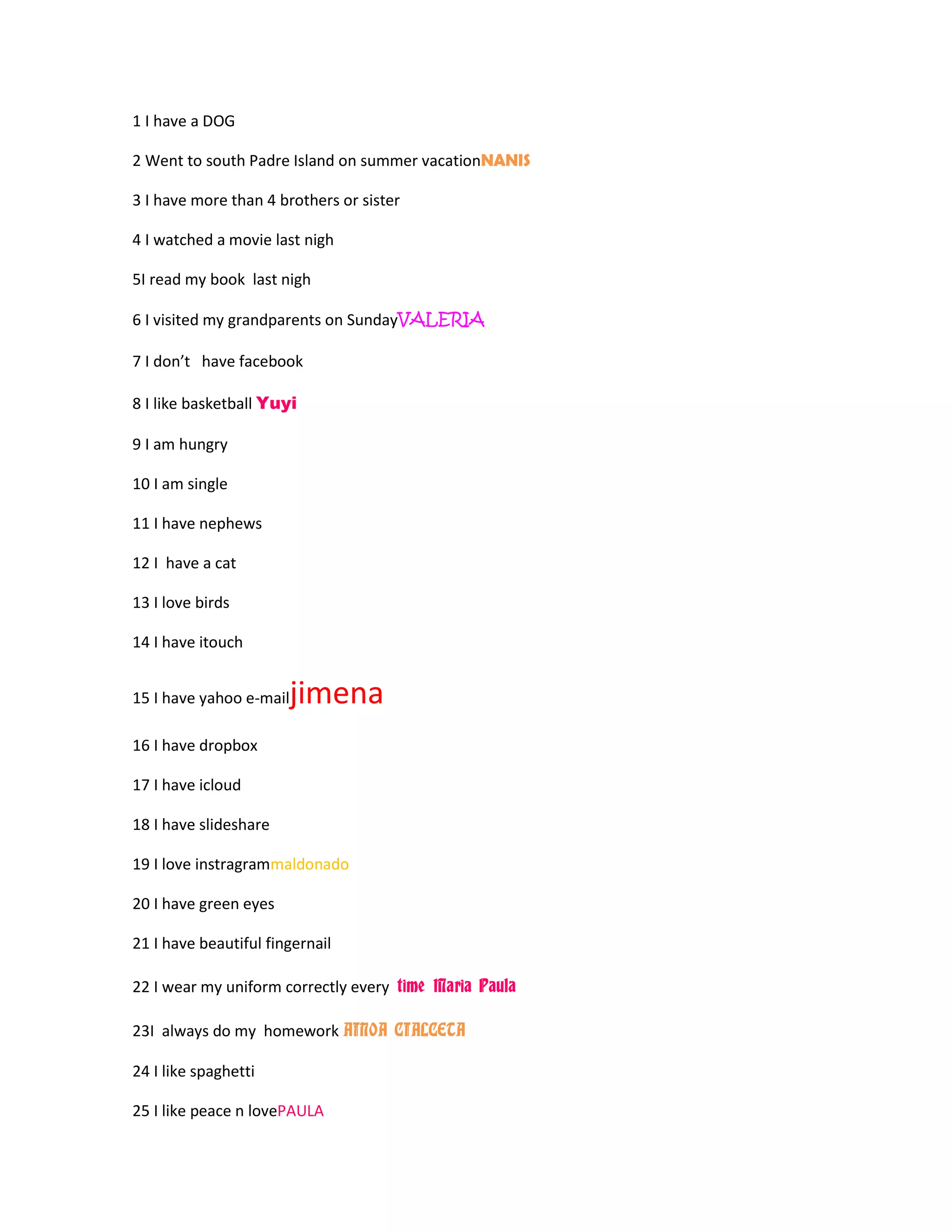 This document contains a collection of short statements about various topics including pets owned, vacations taken, number of siblings, activities enjoyed, favorite classes, places visited, hobbies, physical attributes, and technologies used. Many of the statements are just one line with no additional context or connection to other statements.