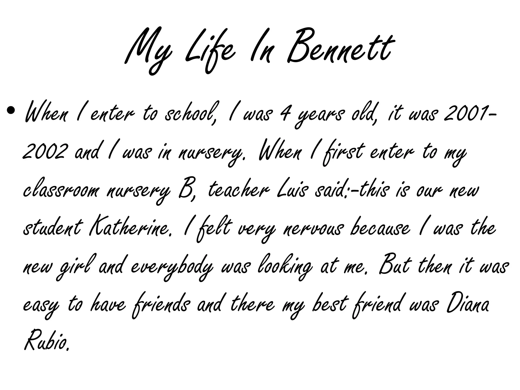 Katherine describes her experiences attending school in Bennett from 2001-2002 when she entered nursery at age 4, making new friends, through being in 5th grade in the present. Some key points she highlights include struggling at first to make friends in nursery but becoming close with Diana Rubio, having a strict teacher in transition that would give her notes, doing well academically with grades of B, and having different best friends over the years like Luisa, Melissa, and now Catalina as she progressed through the school. She is nervous but happy to be passing to 6th grade.