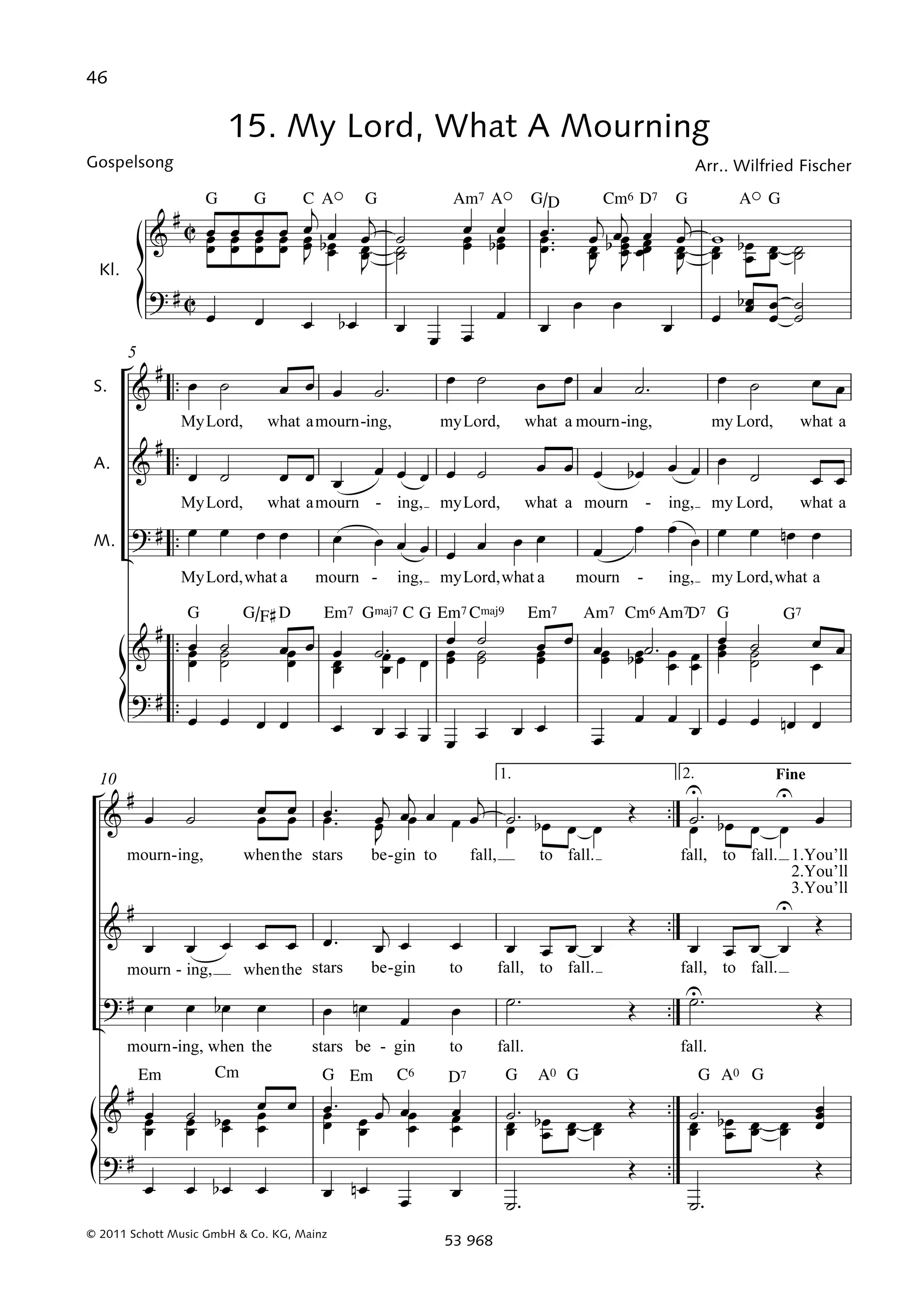 This musical document contains the lyrics and musical notation for the song "My Lord, What a Mourning". The song is in 3 verses with a refrain of "My Lord, what a mourning". The lyrics describe mourning when the stars begin to fall from the sky. It also contains the beginning of another song with lyrics about hearing the trumpet sound to wake the dead and hear both sinners mourn and Christians shout. The musical notation provides the chords and symbols to play the song.