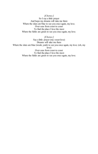 The speaker feels lonely and empty in an empty house since being separated from their love. They wonder where their love is and remember fondly the days they spent together singing songs. The speaker hopes that through prayer and dreams, they can be reunited with their love in a place where the skies are blue and the fields are green to see and hold their love once again.
