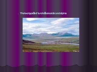 Grant Z discusses the two types of tundras, arctic and alpine. The arctic tundra covers northern regions like Lapland, Siberia, Alaska and Canada, and is a cold, treeless, low-lying plain. Alpine tundra is found at high elevations in mountains. Both are characterized by permafrost that prevents tree growth. Common animals in the arctic tundra include gray wolves, caribou, and arctic foxes.