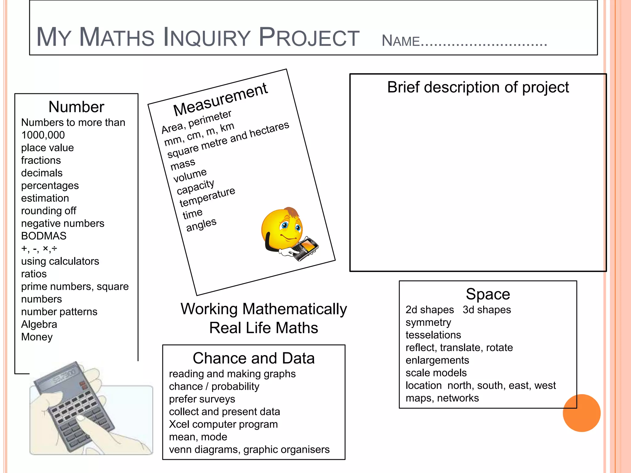 This maths inquiry project covers a wide range of mathematical topics including: place value with numbers up to millions, fractions, decimals, percentages, operations, estimation, negative numbers, ratios, prime numbers, patterns, 2D and 3D shapes, symmetry, money, graphs, probability, data collection and presentation. It also mentions working mathematically and applying math concepts to real life situations.