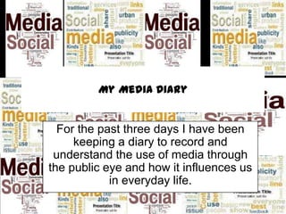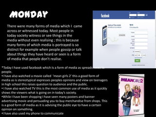 For three days, the author kept a diary recording their daily media use and observations on how media influences society. On Monday, the author used Facebook, watched movies on TV and in theaters, went shopping where they saw advertisements, and used their phone to communicate. They observed that media is ubiquitous in everyday conversations. On Tuesday, the author used the internet, Facebook, read magazines and books, saw advertisements while shopping, and watched TV and movies. On Wednesday, similar media activities like using the internet, Facebook, watching TV and movies in theaters were recorded, along with reading books. The author presented a graph of their three days of media use and concluded with hoping the presentation provided new insights into media's role in society.