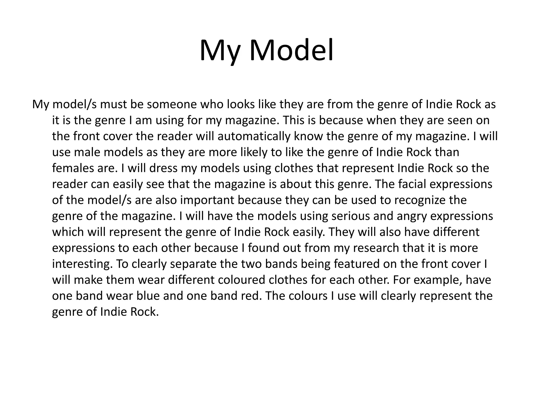 The document discusses choosing models for the front cover of an indie rock magazine. It states that male models will be used who dress in indie rock style clothing and have serious facial expressions to clearly represent the genre. The models will be dressed in different colored outfits to distinguish the two bands featured on the cover.