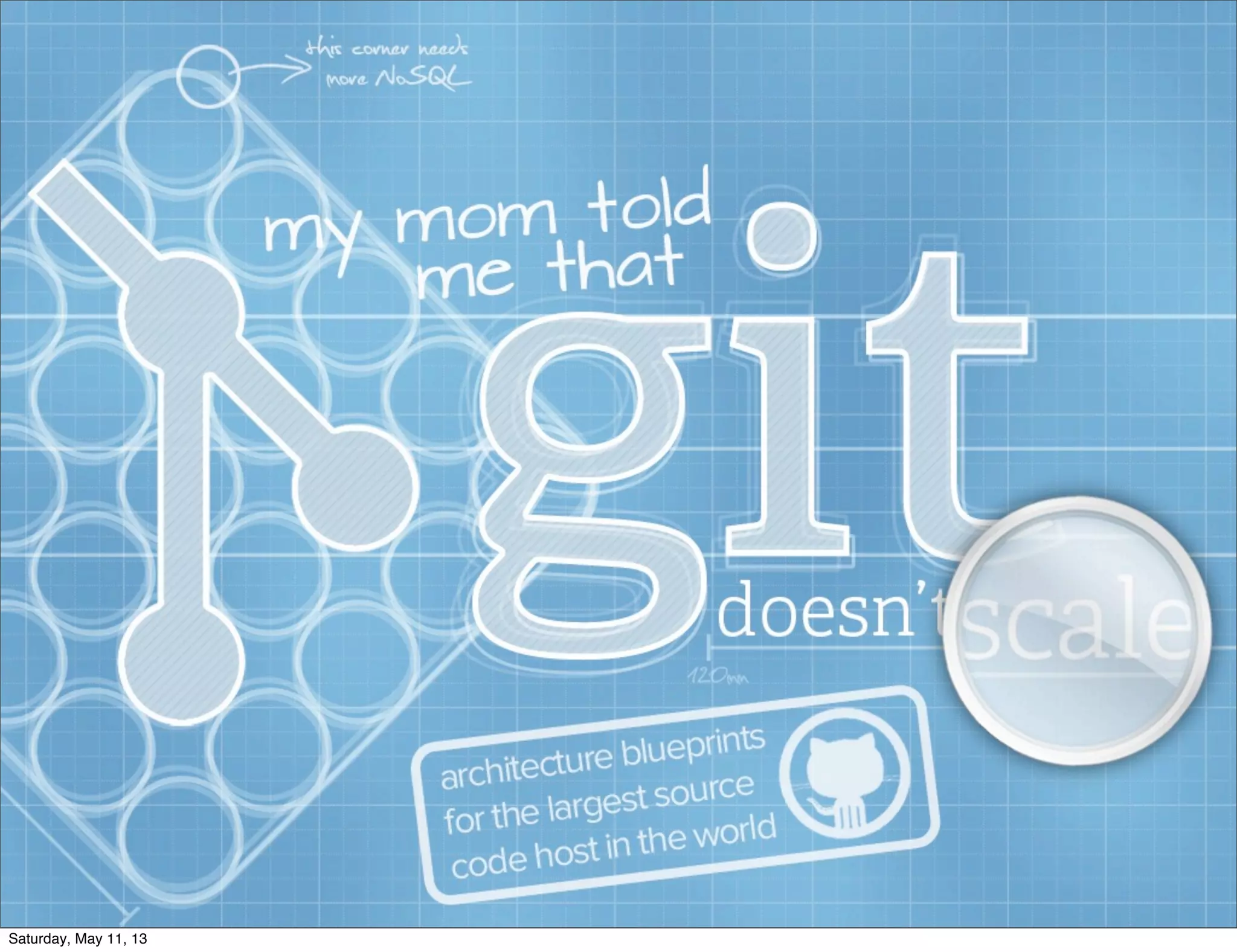 The document discusses the challenges and solutions related to Git hosting and performance issues, particularly in the context of using Git libraries and interfaces. It highlights the evolution of technologies, including Java and NoSQL, while contrasting different software architectures and their impact on efficiency. The narrative emphasizes the need for innovation in backend development while maintaining simplicity and reliability in engineering practices.
