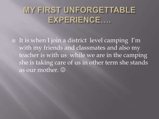 The document describes some of the author's most memorable experiences, including going on a camping trip with friends and teachers where the teacher took care of them, receiving their first bike from their parents to play with friends, going swimming with their family for a reunion, and being happy when meeting their best friend who taught them new things.
