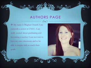 Meghan created a multigenre project for her boyfriend of 6 years to express how much he means to her. The project includes narratives about how they met in middle school when he accidentally hit her in the face with a basketball, informational pieces about what he means to her, a poem expressing her love, and a persuasive piece about how he helped her overcome fears after having a health scare. The overall message is that her boyfriend is her best friend who has helped and supported her through challenges, and she is glad they found each other.