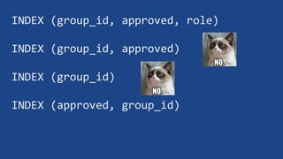 Indexes are used to efficiently retrieve data from MySQL tables. The most common type is the B-Tree index, which allows quick retrieval of data by key and scanning in order. Indexes work by storing pointers to data rows, improving performance for queries that filter, join, group or sort by indexed columns. Good indexes are small, use minimal data types, and cover columns frequently queried, joined on or used for filtering, grouping and sorting.