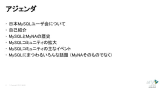 日本MySQLユーザ会について • 自己紹介 • MySQLとMyNAの歴史 • MySQLコミュニティの拡大 • MySQLコミュニティの主なイベント • MySQLにまつわるいろんな話題 (MyNAそのものでなく) 2 © Copyright 2012 MyNA.