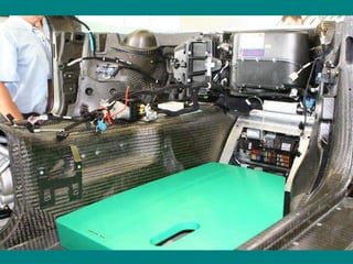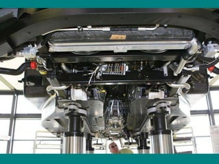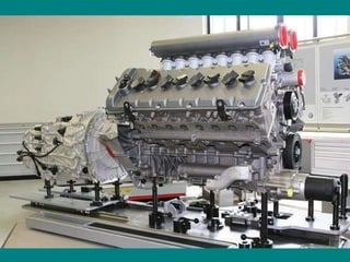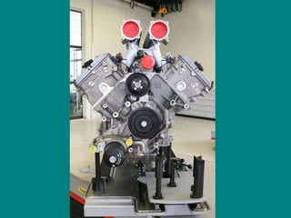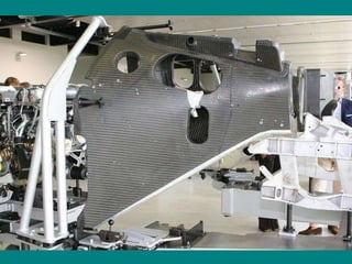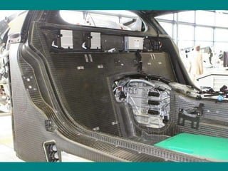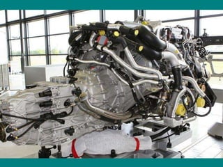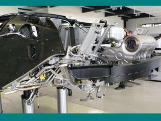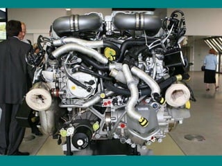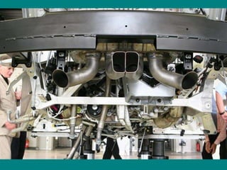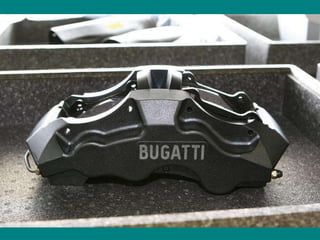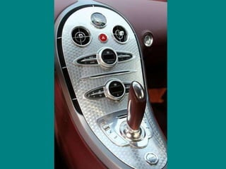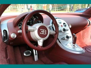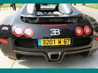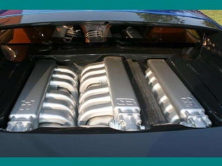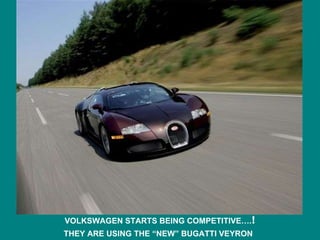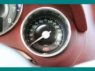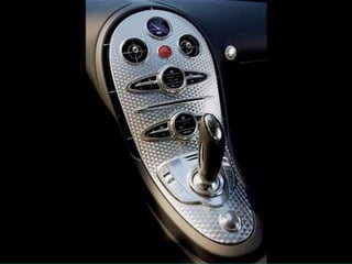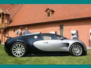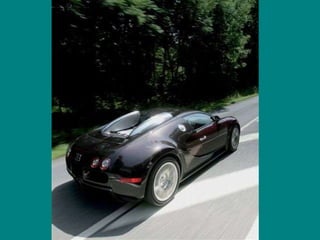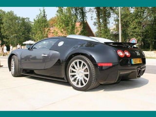 The document introduces the Bugatti Veyron, a unique automobile produced by Volkswagen. It has a W16 engine configuration producing 1001 horsepower. It can accelerate from 0-100 km/h in 2.5 seconds, and reach a top speed of 405 km/h, making it one of the fastest production cars ever made. At top speed, it travels 113 meters in one second. While expensive at €1.23 million, it far surpasses the performance of even ultra-high performance sports cars from competitors like McLaren and Koenigsegg.
