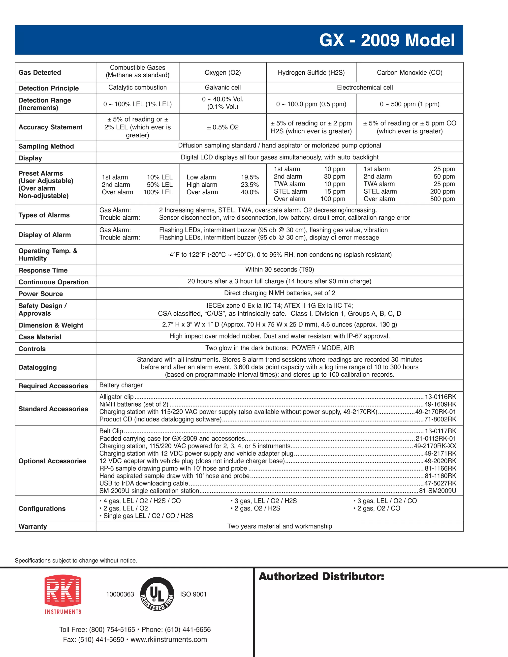 The document describes the GX-2009 personal four gas monitor from RKI Instruments. It is the smallest and lightest 4-gas monitor on the market, weighing only 4.6 ounces. It simultaneously detects combustible gases, oxygen, hydrogen sulfide, and carbon monoxide. Key features include dual audible alarms, vibration alarm, impact resistant body, large data logging capacity, and a 20 hour battery life. The GX-2009 provides gas detection for personal monitoring in hazardous environments.