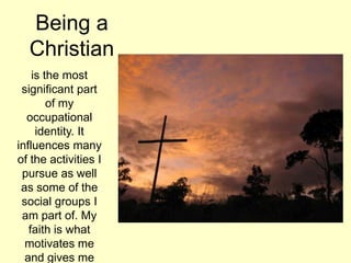 Grace Linton identifies several key occupations that make up her occupational identity, including being a Christian, family member, student, traveler, friend, baker, tea enthusiast, bush explorer, and aspiring occupational therapist. She discusses how each occupation influences her activities, priorities, and sense of self. Being a Christian provides her with motivation and purpose. Family, friends, cooking, and exploring nature are meaningful social occupations for her. Her goals include working overseas as an occupational therapist to help enable people and advocate for disability rights.