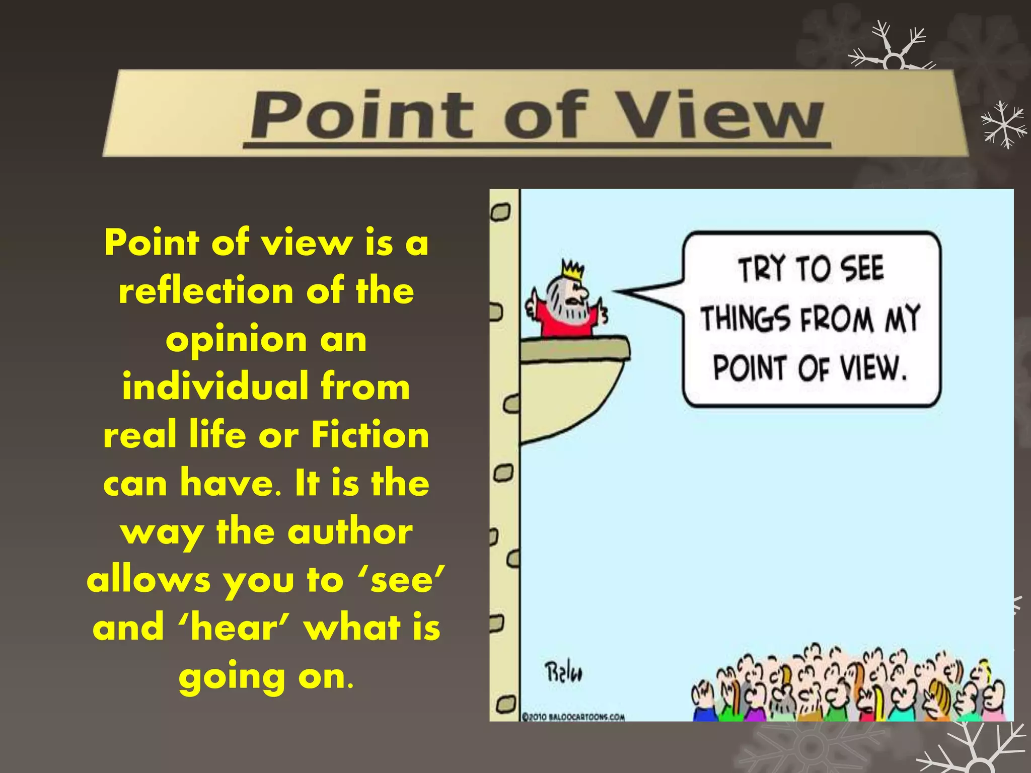 This document discusses different points of view in writing. It defines first, second, and third person points of view based on pronoun use. First person uses I, me, my, etc. Second person uses you and your. Third person uses he, she, they, etc. The document then provides an example of a passage and identifies it as written in third person point of view based on the pronouns used. It also briefly discusses the Oedipal complex, defined as a boy's desire for his mother and jealousy of his father.