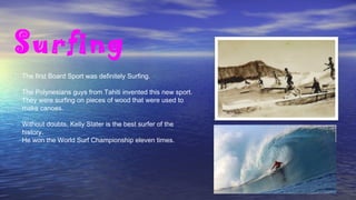 Joaco gave an oral presentation about the history of board sports. The first board sport was surfing, which was invented by Polynesians in Tahiti using wooden boards. Skateboarding later emerged as surfers took their sport to streets and empty pools. Snowboarding was then invented as surfers sought to recreate their sport on snow by attaching skis together. Joaco highlighted many variations of board sports that now exist worldwide and claimed to have invented a new type called "board remote control car".