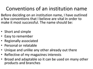 Zoe Toase outlines conventions for naming and designing an institution logo to promote her magazine. She considers names that are short, memorable, regionally associated and reflective of her magazine's interests. After polling an audience, she decides on the name "NERP Media" which stands for "North East Regional Productions." Her logo incorporates the letters NERP in a colorful, geometric design within a rectangle and triangles to represent the institution's purpose of guiding regional media products like her magazine.