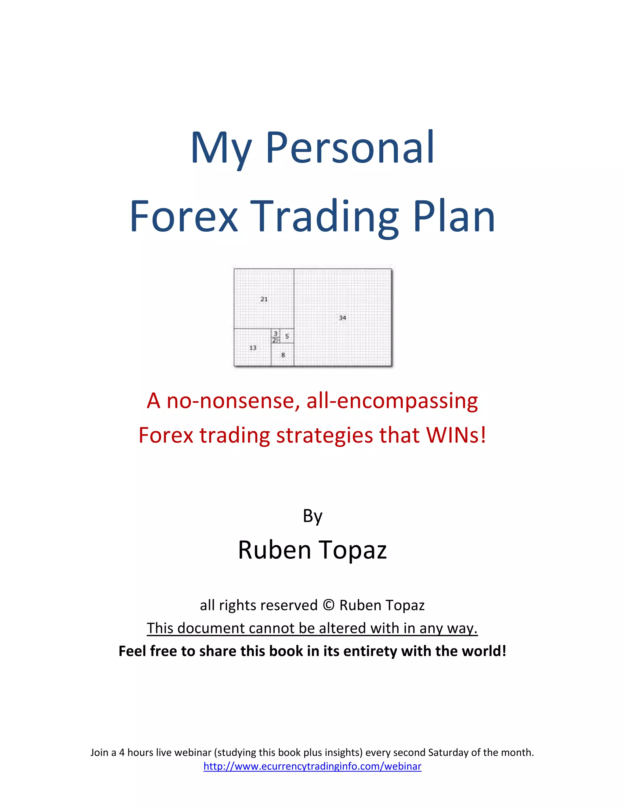 This document is a comprehensive guide to forex trading strategies by Ruben Topaz, detailing methods for achieving better trading results through systematic procedures. It emphasizes the importance of market analysis, particularly using Elliott Wave theory, and provides actionable plans that can benefit both novice and experienced traders. Additionally, it includes links to supplementary resources and webinars for further learning.