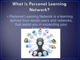 This document discusses various tools that can be used to create a personal learning network, including blogs, Diigo, LinkedIn, Twitter, and Facebook. Blogs allow users to interact and share knowledge with others. Diigo is a multi-functional tool that can improve workflow and knowledge management. LinkedIn enables users to document professional networks. Twitter allows users to follow others who share information about their interests. Facebook offers various topic pages where people can learn.