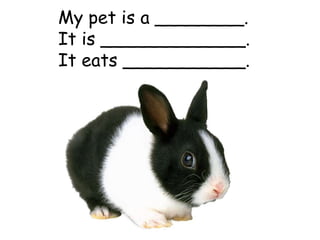 The document describes several pets and provides blanks for the type of pet, its characteristics, and what it eats. For each pet described, these key details are not filled in, leaving the information incomplete.